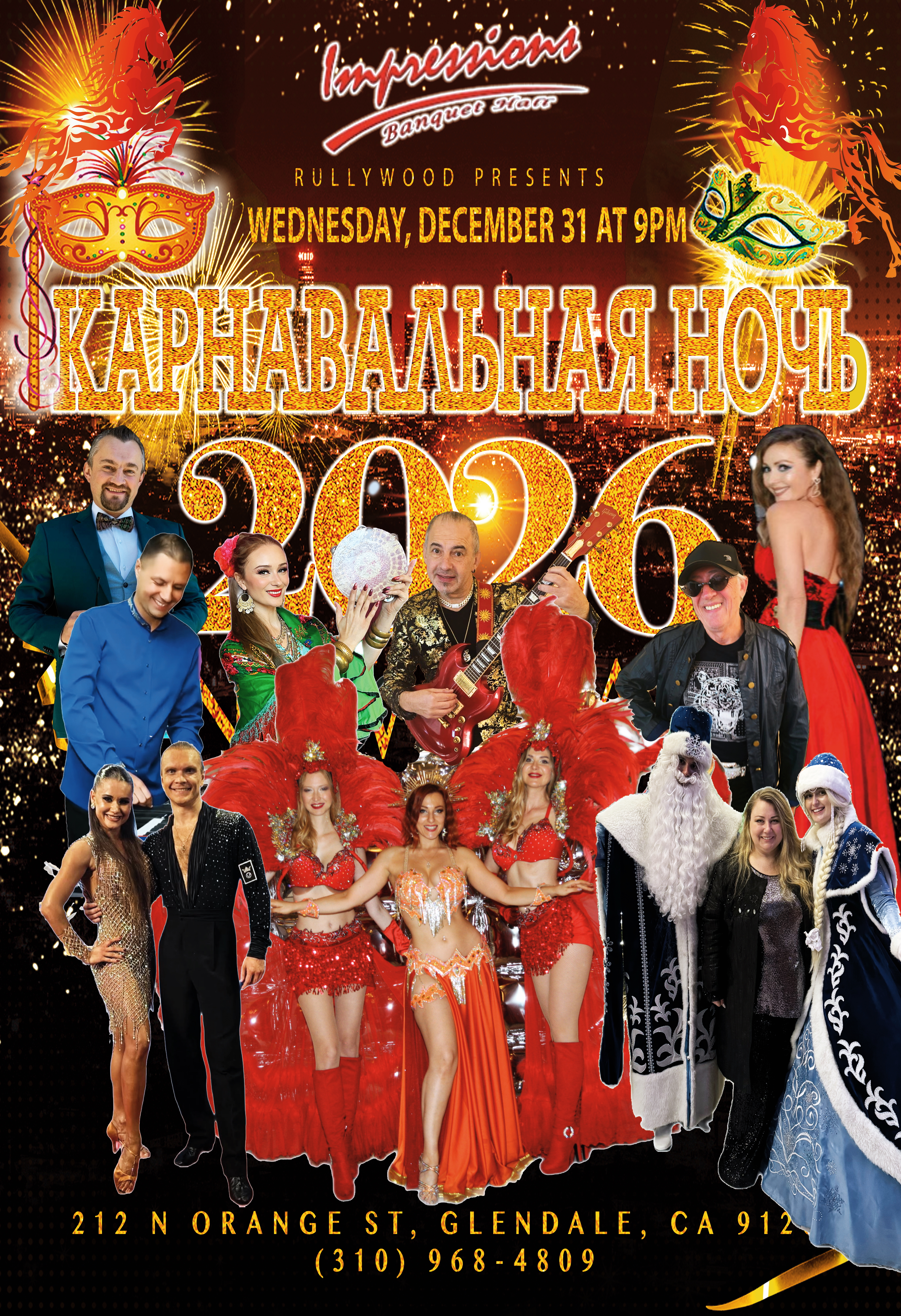 С Новым 2026 годом! Вкусный ужин, напитки всю ночь, фотографии на красной дорожке, танцы, музыка, Дед Мороз и Снегурочка! В программе: DJ Чайка, Игорь Офицеров, Леня Гальперин, Миша Ларкинс и Pandora Entertainment. Входной билет — 300 долларов. Дорогие друзья, добро пожаловать на очередную волшебную вечеринку Happy 2026 New Year's Eve! Любители костюмов, добро пожаловать! Приготовьтесь насладиться уникальными выступлениями, вкусной едой и безлимитными напитками в компании самых красивых людей Лос-Анджелеса! Вечеринка пройдет в потрясающем месте — банкетном зале «IMPRESSIONS». Оденьтесь так, чтобы произвести впечатление!. На красной дорожке для вас будут работать профессиональный фотограф и видеограф. Все 300 гостей получат VIP-подарочные пакеты! Забронируйте место за красивым столом с уникальным украшением в центре, изысканным ужином, напитками весь вечер, профессиональными танцорами, певцами и живой музыкой. Ведущий новогодней ночи — Сергей Сахар! Вас ждет вкусный ужин от банкетного зала IMPRESSION и красиво оформленный новогодний десертный стол! Вас ждут Дед Мороз и Снегурочка! ЗАКУСКИ: - Салат «Столичный» - Греческий салат - Мясное ассорти - Сырное ассорти - Ассорти оливок - Рыбное ассорти - Бёрек с сыром - Маринованные овощи - Блины с красной икрой - Говяжий язык - Силедочка - Коктейль из креветок - Пельмени - Блины с говядиной - Горячий картофель ГОРЯЧИЕ БЛЮДА: - Филе лосося с овощами - Говядина барбекю с картофелем - Куриный люля-кебаб с рисом басмати УЖИН ВКЛЮЧАЕТ АЛКОГОЛЬ на выбор: - Безалкогольные напитки и газировка - Ледяная водка Grey Goose - Ледяной Ketel One - Johnny Walker Black - Текила Patron Silver - Hennessy VS Cognac - Красное или белое Вино - Шампанское - В 12:00 специальные бокалы шампанского - Кофе/Чай ДЕСЕРТЫ: - Тирамису - Трес Лечес - Крем-брюле - Фруктовый пирог - Мусс из манго Встретьте Новый год 2026 вместе с друзьями и семьей в банкетном зале Impression! КАЖДЫЙ ГОД НАШИ БИЛЕТЫ РАСПРОДАНЫ. МЫ РЕКОМЕНДУЕМ ПОКУПАТЬ БИЛЕТЫ ЗАРАНЕЕ. Для бронирования звоните по телефону (310) 968-4809.